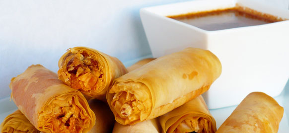Lay a sheet of phyllo on a clean, dry work surface and brush it with melted butter. Top with two more sheets, lightly buttering each as you go. Cut the layered phyllo into six long rectangles. Place one tablespoon of the goat cheese filling at the base of each rectangle and roll up the phyllo, folding in the sides as you go. Repeat twice more to make 18 rolls total.