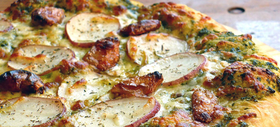 Using a large spoon, spread an even layer of the pesto onto the dough and carefully spread it to within 1/2-inch of the edge, being careful to leave a sauce free edge. Top with an even layer of the grated mozzarella/provolone cheese followed by slices of parboiled potatoes and roasted garlic cloves. Top with a light sprinkling of a bit more mozzarella, season with salt to taste and a pinch of red pepper flakes. Lightly brush the exposed crust with a bit of olive oil (or leftover garlic) oil to promote browning.